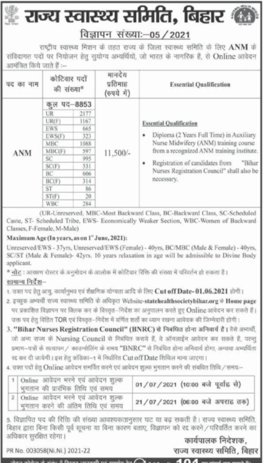 (State Health Society Bihar SHSB ANM Post Recruitment 2021)(Advt. No. 05/2021) (Total: 8853 Post) |